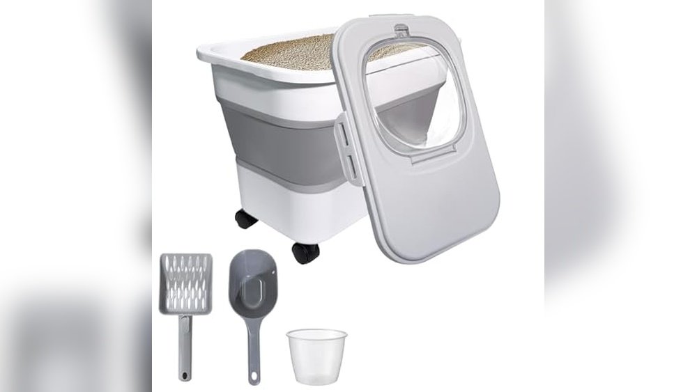 This cat litter storage container from SECOAT features a smart collapsible design, allowing it to fold down when not in use, saving valuable space in your home. The inclusion of rolling casters makes it easy to move the container around, whether you’re cleaning or refilling the litter. Its airtight lid seals in odors and moisture, helping to maintain a clean and fresh environment both for your cat and your living space. The container is also BPA-free, ensuring it is safe for pets.